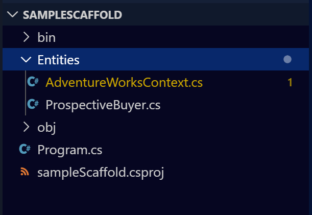 This sample command will create only the ProspectiveBuyer entity class inside the directory Entities. It will also create the dbcontext.